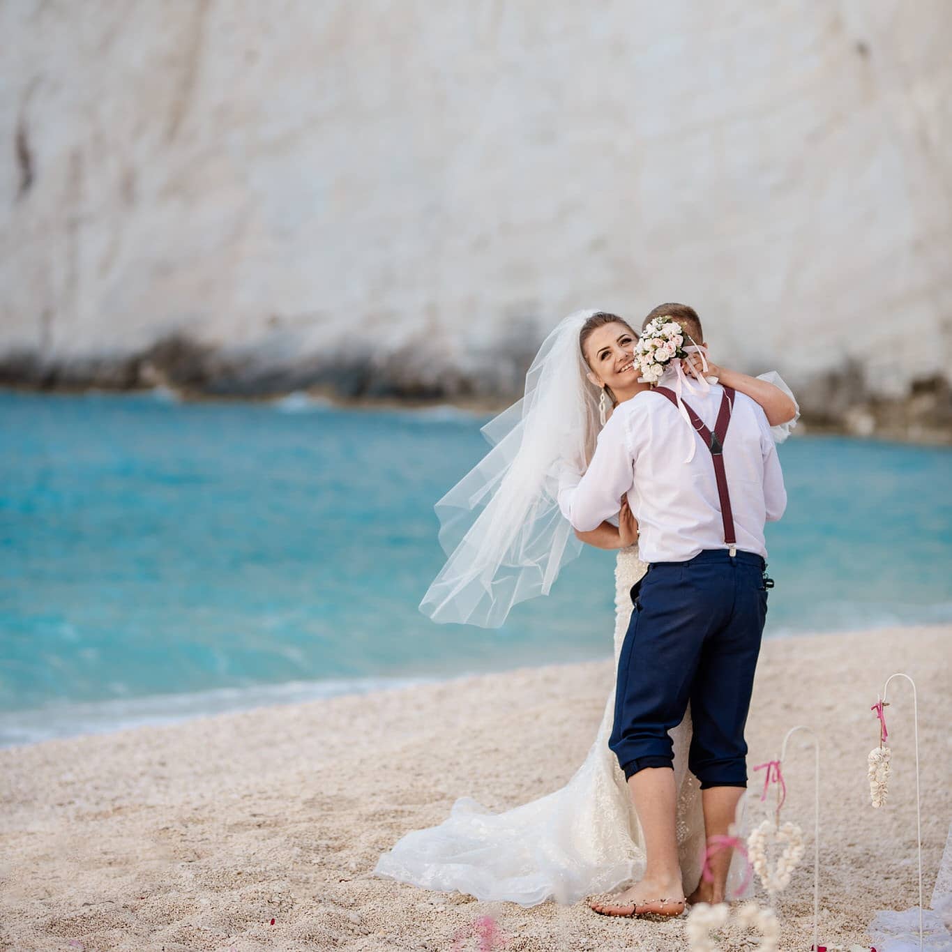 Aleksandra i Kamil pragnęli zaskoczyć swoich bliskich i uczynić ten dzień jeszcze bardziej wyjątkowym. Zamiast tradycyjnej ceremonii, postawili na ślub we dwoje – tylko oni, na plaży Navajo, w blasku greckiego słońca. Zdecydowali się na minimalizm, wybierając delikatne, subtelne dekoracje, które idealnie komponowały się z naturalnym pięknem miejsca. Piasek, błękit morza i klif w tle – to wszystko, co było im potrzebne, by stworzyć niezapomnianą atmosferę.