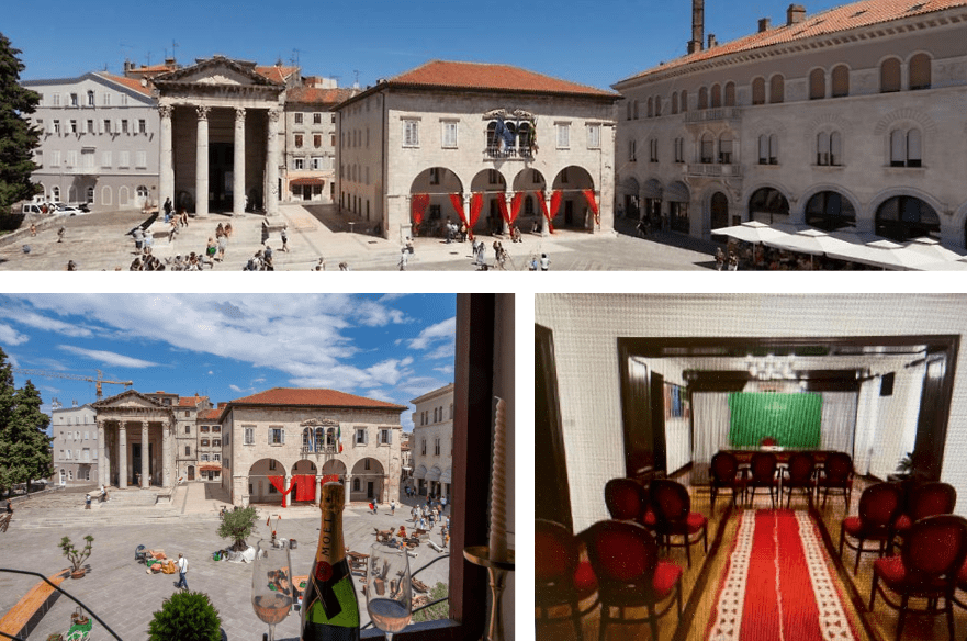 Pula, położona w Istrii, oferuje niezwykle klimatyczną salę ślubów w historycznym centrum miasta. Sala ślubów mieści się w samym centrum starego miasta, w antycznym budynku. Po uroczystości możecie udać się na sesję zdjęciową do amfiteatru z czasów rzymskich, na malowniczą promenadę nadmorską lub na wzgórze z twierdzą, skąd rozciąga się widok na port i zatokę. Połączenie antycznej architektury z błękitem Adriatyku sprawia, że każda fotografia wygląda jak z pocztówki.