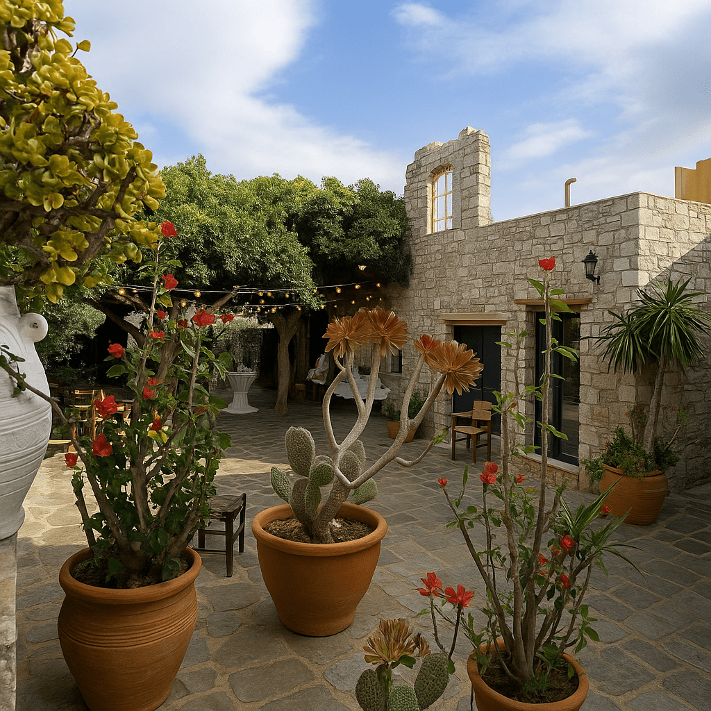 Zamiast tłocznej plaży – wyobraźcie sobie kameralną, podgórską posiadłość położoną zaledwie 5 km od Heraklionu, w otoczeniu winnic, oliwnych drzew i sielskiego krajobrazu. To miejsce, w którym możecie zorganizować ślub na Krecie dokładnie tak, jak chcecie: z ceremonią pod gołym niebem, w cieniu drzew, przy kapliczce lub na kamiennym tarasie z widokiem na góry.