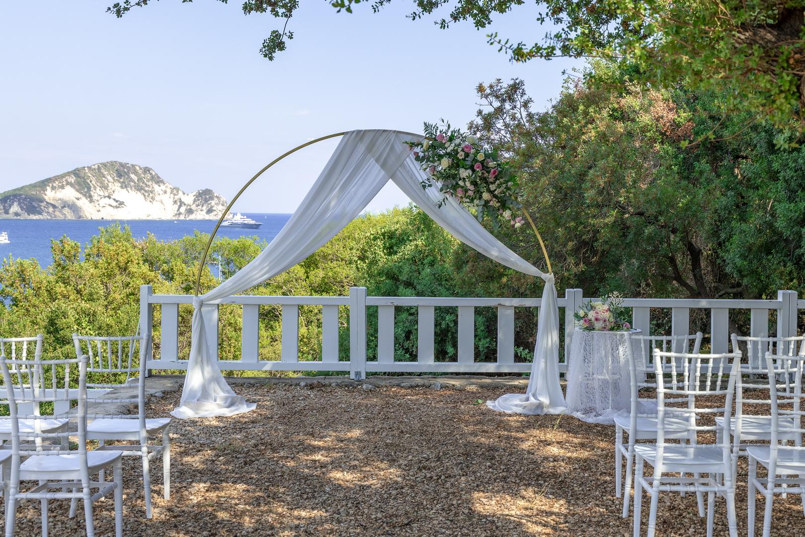 Pakiet „Ślub na tarasie z widokiem na Wyspę Żółwia” to idealna opcja dla par pragnących ceremonii w spektakularnej scenerii. Taras widokowy zapewnia prywatność oraz niepowtarzalny krajobraz jako tło Waszych przysięg. W pakiecie oferujemy: organizację ceremonii cywilnej na, elegancką dekorację inspirowaną greckim stylem, fotografa aby uwiecznić każdą chwilę, oraz toast lokalnym winem z Zakynthos, aby uczcić ten wyjątkowy moment.